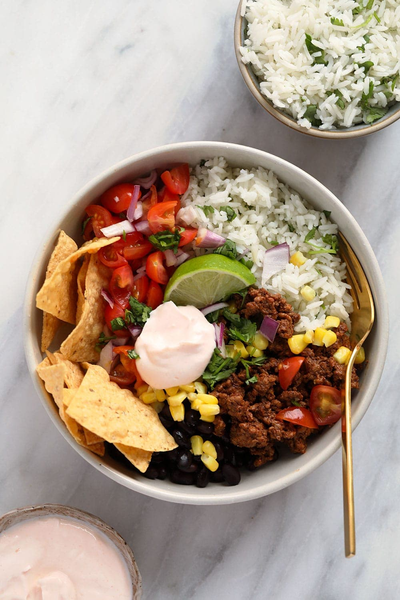 rundsgehakt, avocado, kerstomaatjes, mais, komkommer, rode uien, sriracha mayonaise, lente-uitjes, & nacho's