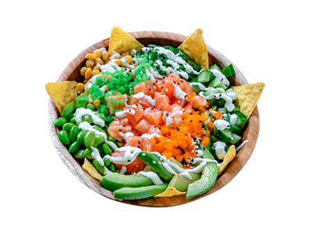 zalm, avocado, zeewiersalade, edamame, komkommer, maïs, wasabimayo, sesam mix, masago & nacho's