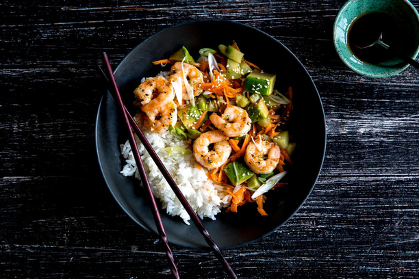 Bruine Rijst Zalm Avocado, Edamme, , Mais Gember soja dressing Zaden mix, Walnoten