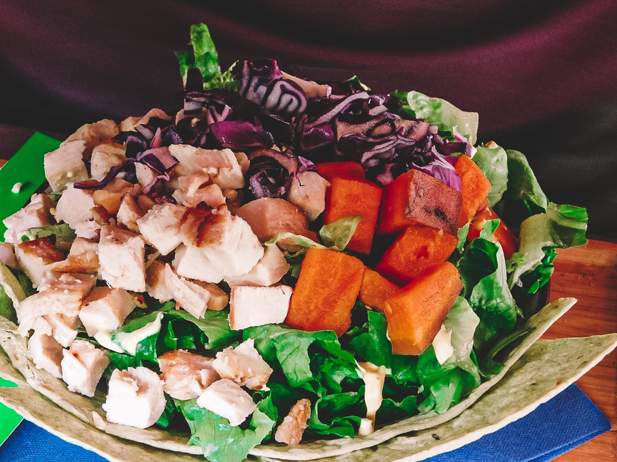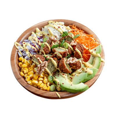 Huisgemaakte falafel, avocado, maïs, wortelen, hummus, rode uien, honing mosterd, lente-uitjes, chilivlokken & walnoten