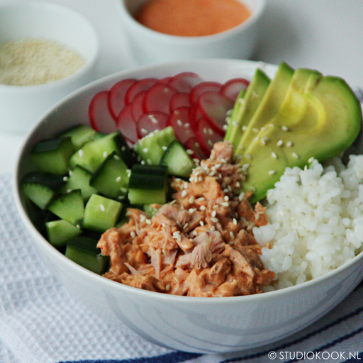 rijst Kip Rode ui, Mango, Komkommer, Avocado Sriracha mayo Uien crunch, Kameya japanse crunch, Lente ui