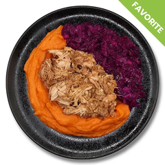 Pulled Chicken, Zoete Aardappel Puree & Rode Kool